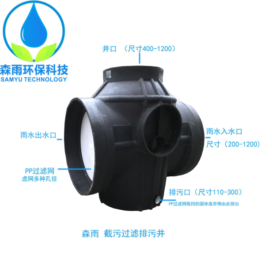 截污過濾井 井內底配有個集水坑 集水坑底部留有個110排污口,當被PP過濾網截住的固體廢棄物就可以在排污口處被部分水流帶走,避免污物堆積過多堵塞慮網導致井過濾功能性喪失。