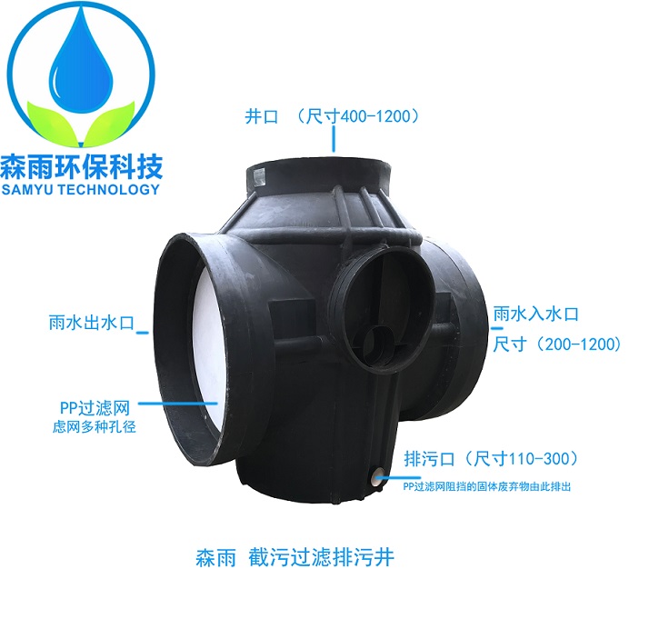 截污過濾井 井內(nèi)底配有個(gè)集水坑  集水坑底部留有個(gè)110排污口,當(dāng)被PP過濾網(wǎng)截住的固體廢棄物就可以在排污口處被部分水流帶走,避免污物堆積過多堵塞慮網(wǎng)導(dǎo)致井過濾功能性喪失。